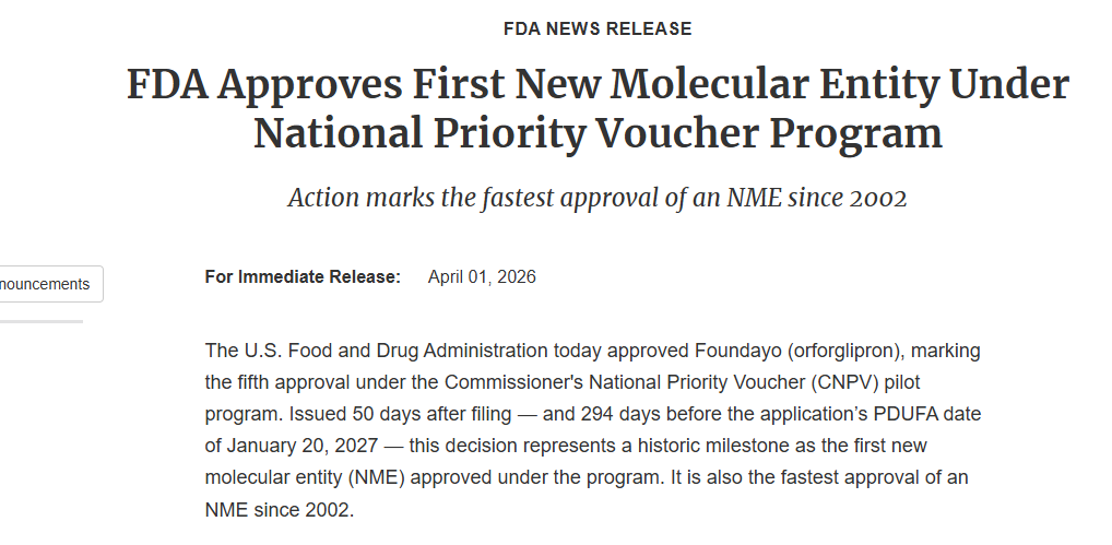 此次批准距离礼来向FDA提交该药申请仅数月时间,该申请通过了一项针对“国家优先药物”的快速审评通道。这意味着,礼来推出Foundayo的时间仅比诺和诺德的Wegovy口服版晚约三个月,这两家制药商将围绕GLP-1新药展开下一轮对决。