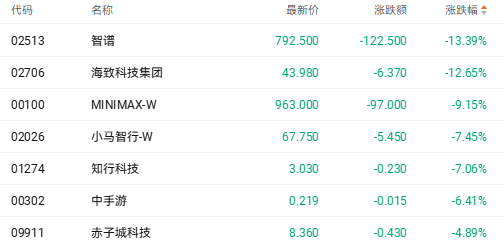 截至午盘,智谱(02513.HK)跌13.39%,海致科技集团(02706.HK)跌12.65%,MINIMAX-W(00100.HK)跌9.15%。