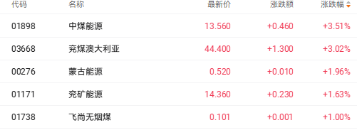 截至午盘,中煤能源(01898.HK)涨3.51%,兖煤澳大利亚(03668.HK)涨3.02%,兖矿能源(01171.HK)涨1.63%。