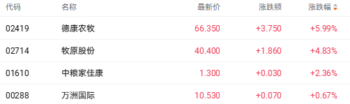 截至午盘,德康农牧(02419.HK)涨5.99%,牧原股份(02714.HK)涨4.83%,中粮家佳康(01610.HK)涨2.36%。