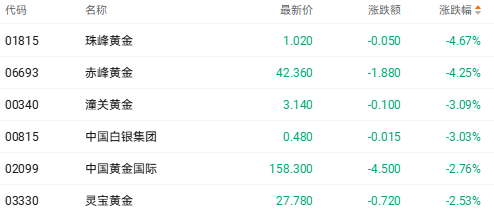 截至午盘,珠峰黄金(01815.HK)跌4.67%、赤峰黄金(06639.HK)跌4.25%、灵宝黄金(03330.HK)跌2.53%。