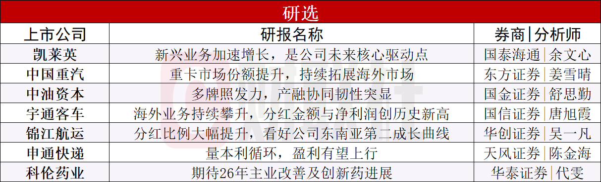 ④宇通客车(国信证券|唐旭霞):宇通客车是兼具成长和红利的全球大中客龙头,国信证券唐旭霞看好公司业绩持续释放,全年分红金额55亿元,创历史新高,分红率约100%,持续回馈股东。展望2026年全年,一方面叠加出口销量增长(包括新能源占比提升)、国内企稳以及场景开拓(城间车、座位客车新能源渗透率提升),公司有望持续获得高质量发展。出口市场宇通打造“技术+服务出口”创新模式,抓住海外新能源发展窗口期持续突破,从“制造+销售产品”→“制造服务型+解决方案”定位升级,竞争力持续攀升,海外布局逐步从亚洲、拉美、非洲等地区,向欧洲等客车工业发达地区拓展,推动产业价值链迈向中高端,有望充分受益于海外新能源扩张。风险提示:行业复苏不达预期等。