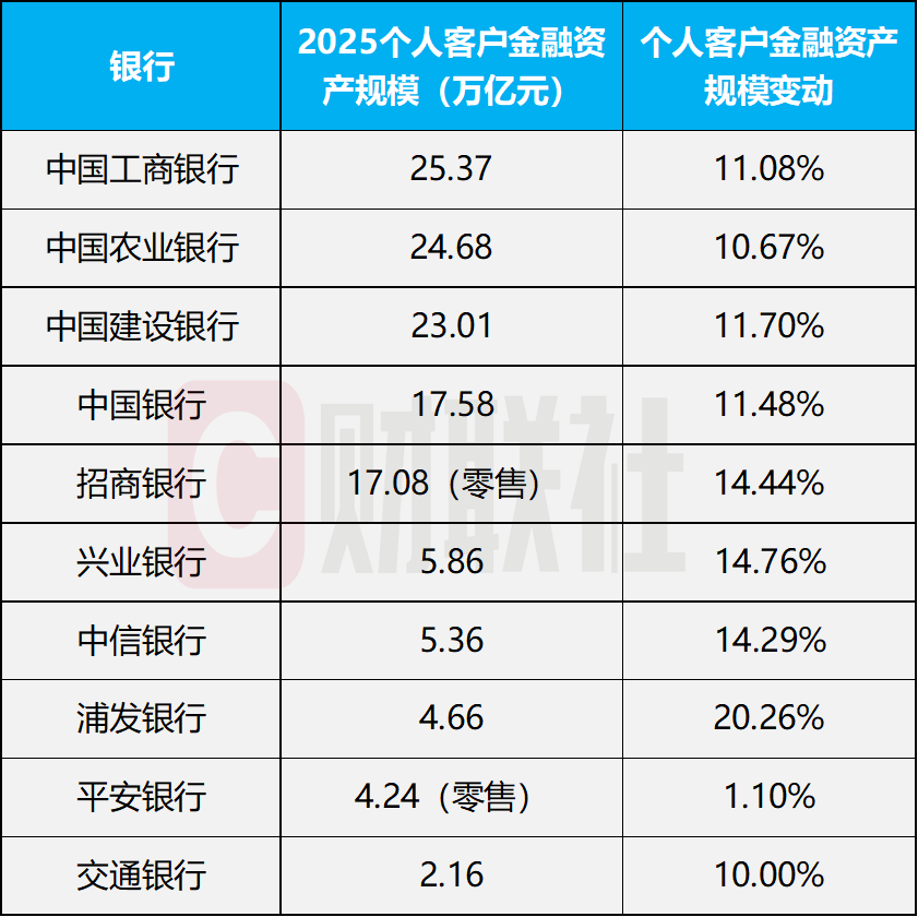 数据显示,2025年,已披露数据的10家银行中,个人客户金融资产规模普遍实现正增长,且9家银行规模增长超10%;