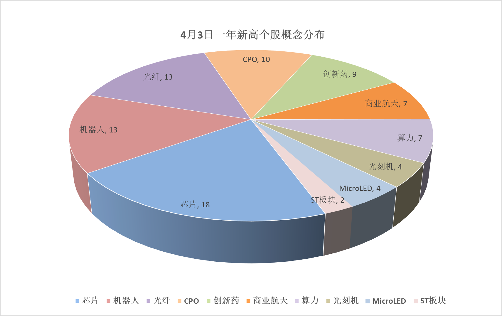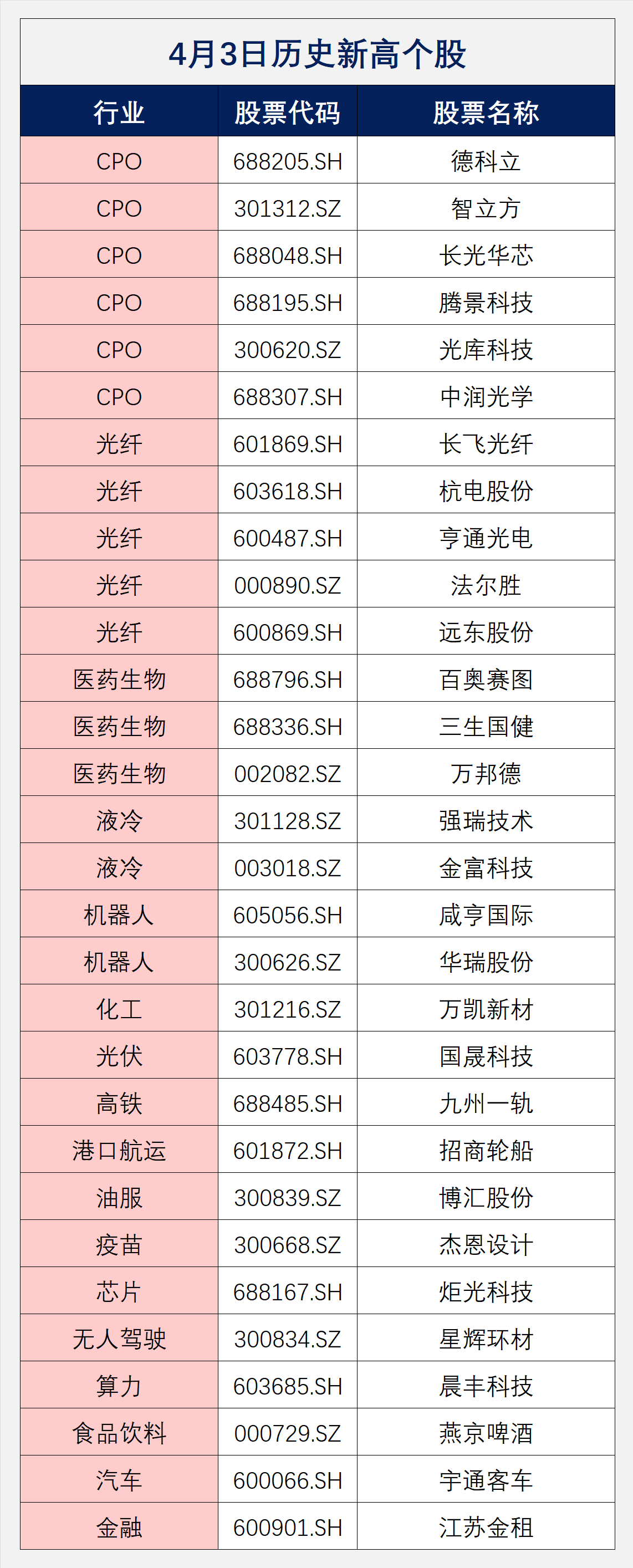 点评:创一年新高个股较上个交易日增加3家至66家。其中,前三的芯片、机器人、光纤概念分别有18、13、13家个股创一年新高。历史新高个股占比中CPO位列第一,中信建投证券表示,相较于传统的云计算网络,AI训练组网由叶脊架构向胖树架构转变,交换机和光模块数量大幅提升,且随着通信数据量的增加,对光模块的速率要求也更高,整个光模块产业链迎来量价齐升的景气周期。相关个股:广合科技的PCB产品有应用于AI服务器、高速交换机、新代际通用服务器和光模块等领域;阿莱德拥有以金刚石为导热填料的导热凝胶产品,可应用于光模块、芯片散热等领域。