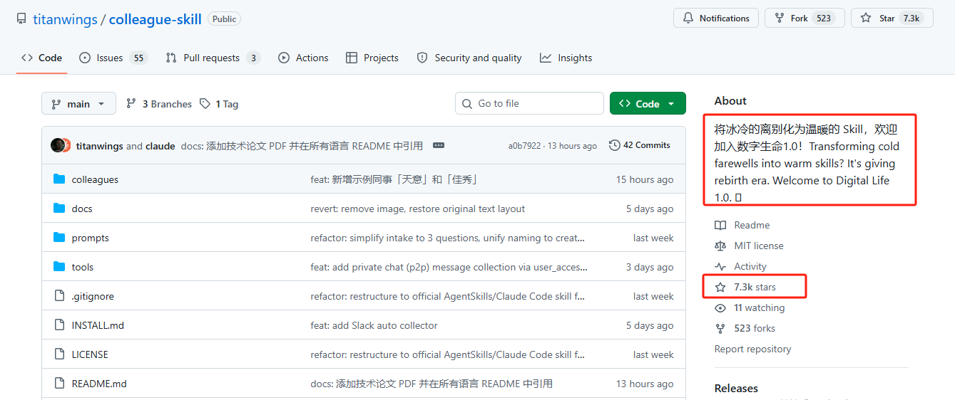 ①开源项目“同事.skill”上线五天收获7.3千星标并快速出圈;