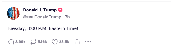 周日晚些时候,特朗普在Truth Social上发布了一条消息:“美东时间周二晚上8点(北京时间周三早上8点)!”,但没有做任何解释。白宫周日透露,这一日期现在是伊朗与美国达成协议的最后期限。