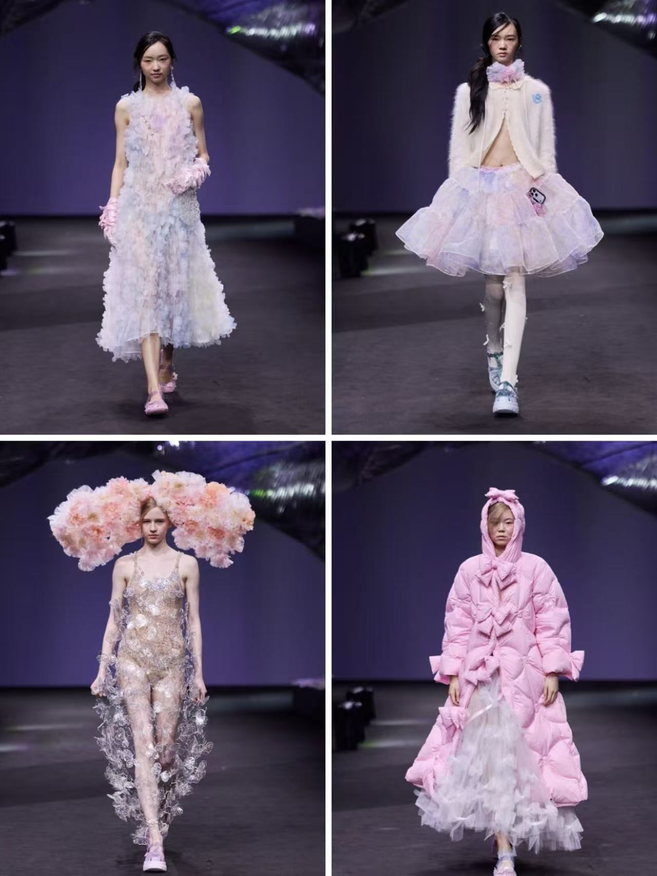 SUSAN FANG呈现了蝴蝶结、丝带、环扣交织的空灵质感,定格梦境与现实之间的诗意瞬间。整场发布融合木乃伊隐喻、上世纪五六十年代复古轮廓、滑雪夹克、复古花园印花与ASCII数字编码等多元符号,以品牌标志性“空气编织”、空气褶裥、3D珠绣、3D打印配饰等工艺,实现手工艺温度与科技创新的平衡,注入战士般的力量感与叛逆姿态,呈现可穿戴的诗意美学。
