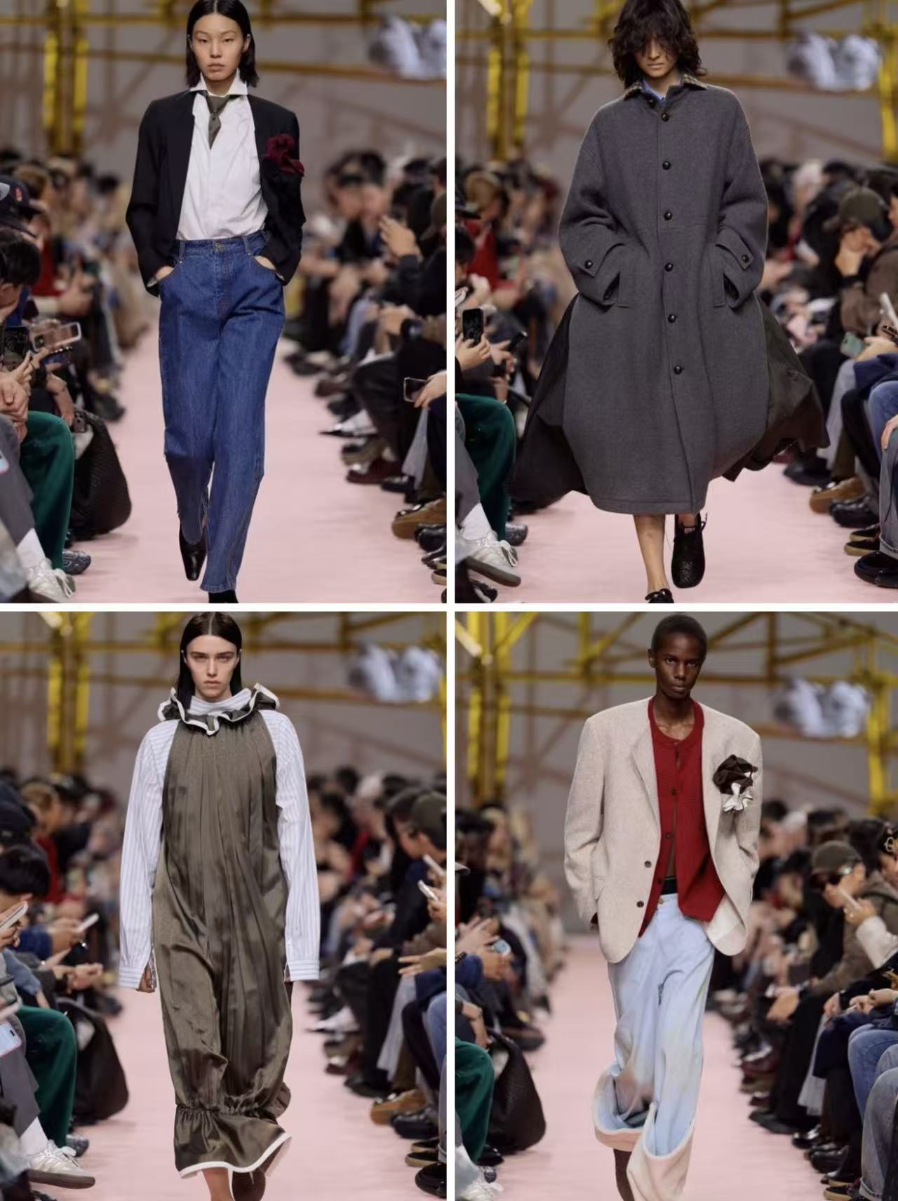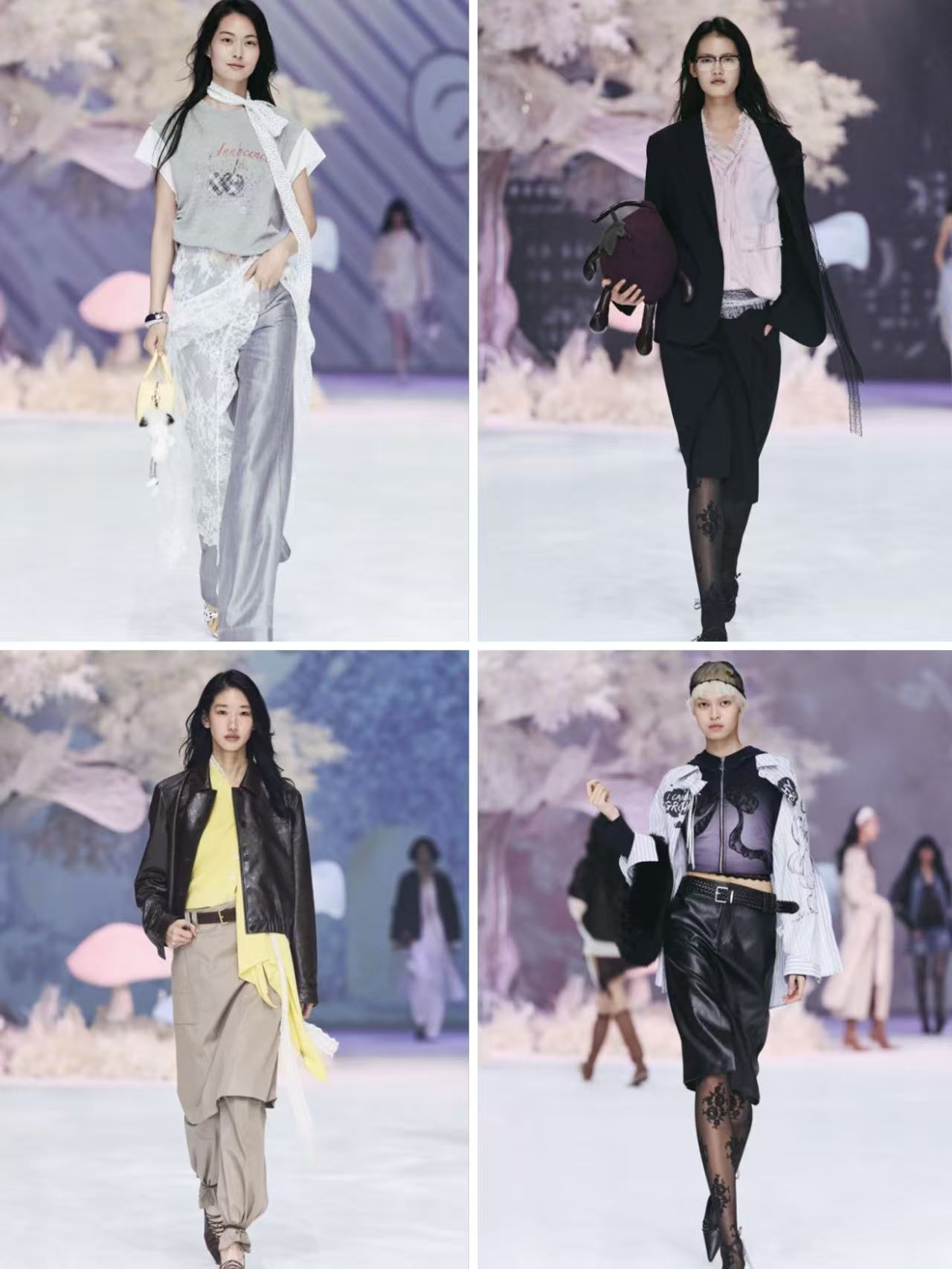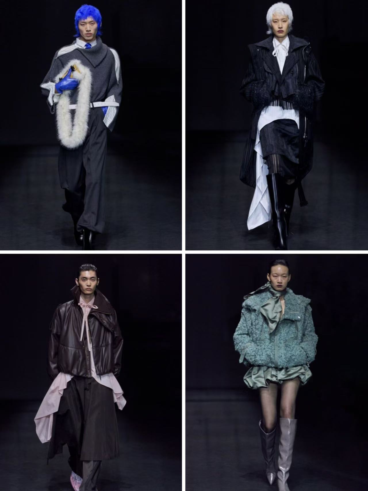YCH聚焦舞台落幕之后的无名追光者,在T台之上刻画学生、职场女性、调酒师等身份各异却心怀热爱的平凡人物。整场发布以结构化版型与精密剪裁为核心优势,通过垂坠、层叠与线条切割构建独特设计体系,在戏剧化表达与现实可穿性之间建立微妙平衡。