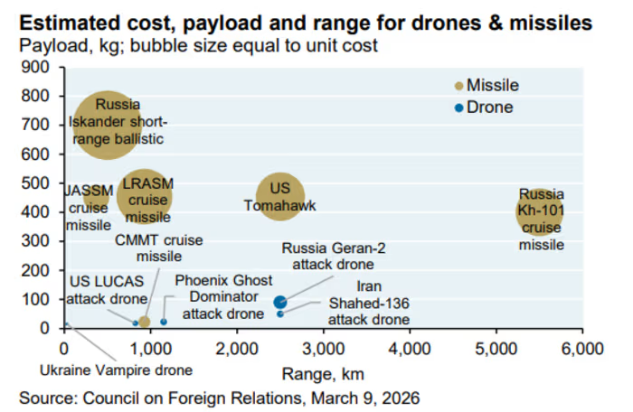 “虽然无人机的有效载荷要小得多,但只需少量有效载荷就能对昂贵的飞机、舰船和雷达系统造成巨大破坏。不过另一方面,无人机的单位成本比许多导弹系统携带的有效载荷要多,”他写道。