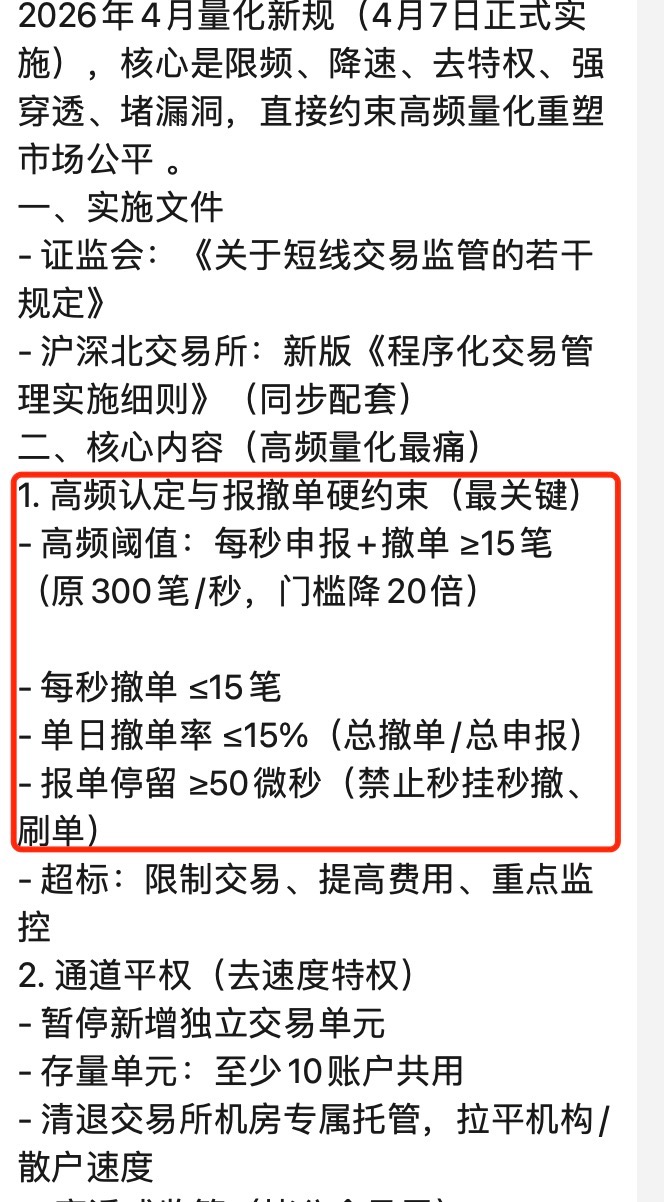 “逻辑上看,小作文也是无稽之谈,高频交易新规300笔/秒是2025年刚刚落地,今年4月再落地短线新规,若需调整应同步废止去年的高频交易新规,但目前没有废止。”上述券商分析师表示。