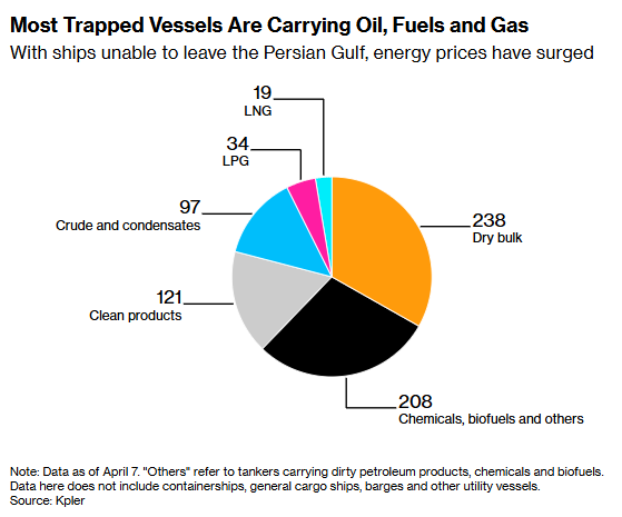 根据Kpler的数据,在困于海峡内的船队中,运输能源的船只占了很大一部分——这些船只中有逾400艘油轮装载着原油和清洁燃料等,此外还有34艘液化石油气运输船和19艘液化天然气船。其余则有大量干散货船(如装载农产品或金属产品)或集装箱船。