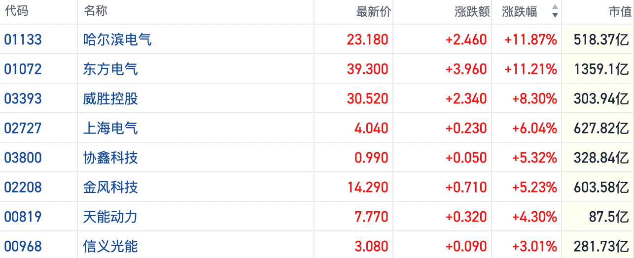 截至发稿,哈尔滨电气(01133.HK)、东方电气(01072.HK)双双涨超11%,威胜控股(03393.HK)涨逾8%,上海电气(02727.HK)等多只个股跟涨5%以上。