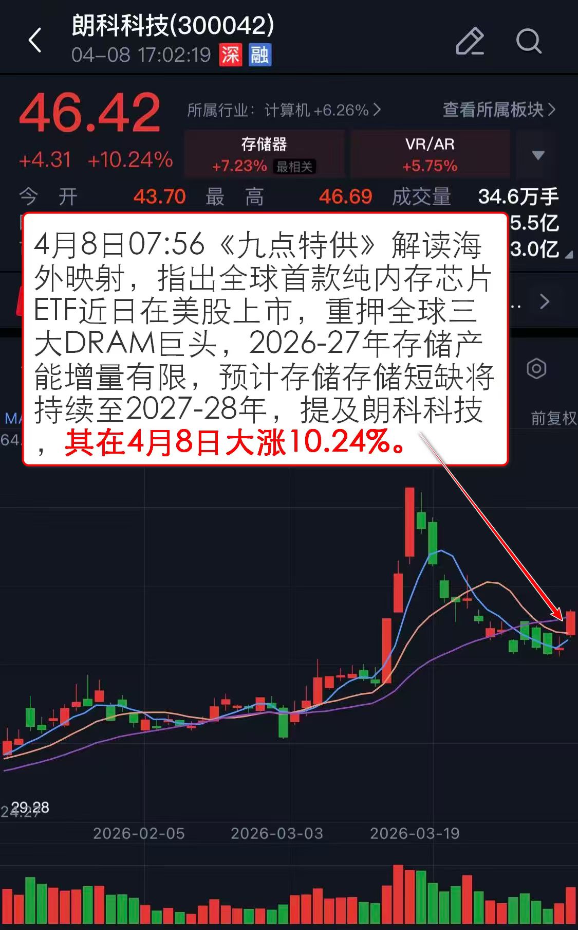 往期回顾:4月8日07:56《九点特供》解读海外映射,指出全球首款纯内存芯片ETF近日在美股上市,重押全球三大DRAM巨头,2026-27年存储产能增量有限,预计存储存储短缺将持续至2027-28年,提及朗科科技,其在4月8日大涨10.24%。