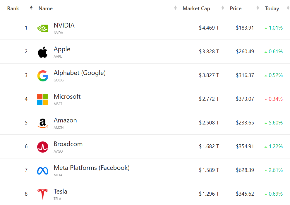 科技巨头多数走强,(按市值排列)英伟达涨1.01%,苹果涨0.61%,谷歌C涨0.52%,微软跌0.34%,亚马逊涨5.6%,博通涨1.22%,Meta涨2.61%,特斯拉涨0.69%。