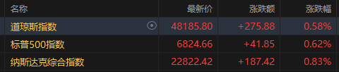 截至收盘,标普500指数涨0.62%,报6824.66点;纳斯达克综合指数涨0.83%,报22822.42点,均连涨7个交易日。道琼斯指数涨0.58%,报48185.80点,年内由跌转涨。