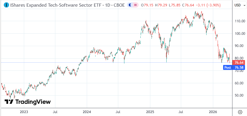 在大盘反弹的同时,软件板块仍在承压,iShares扩展科技软件行业ETF(IGV)跌3.9%,收于2023年11月来新低。本周早些时候,Anthropic又发布了一系列人工智能代理工具,重燃了市场对软件行业的担忧。