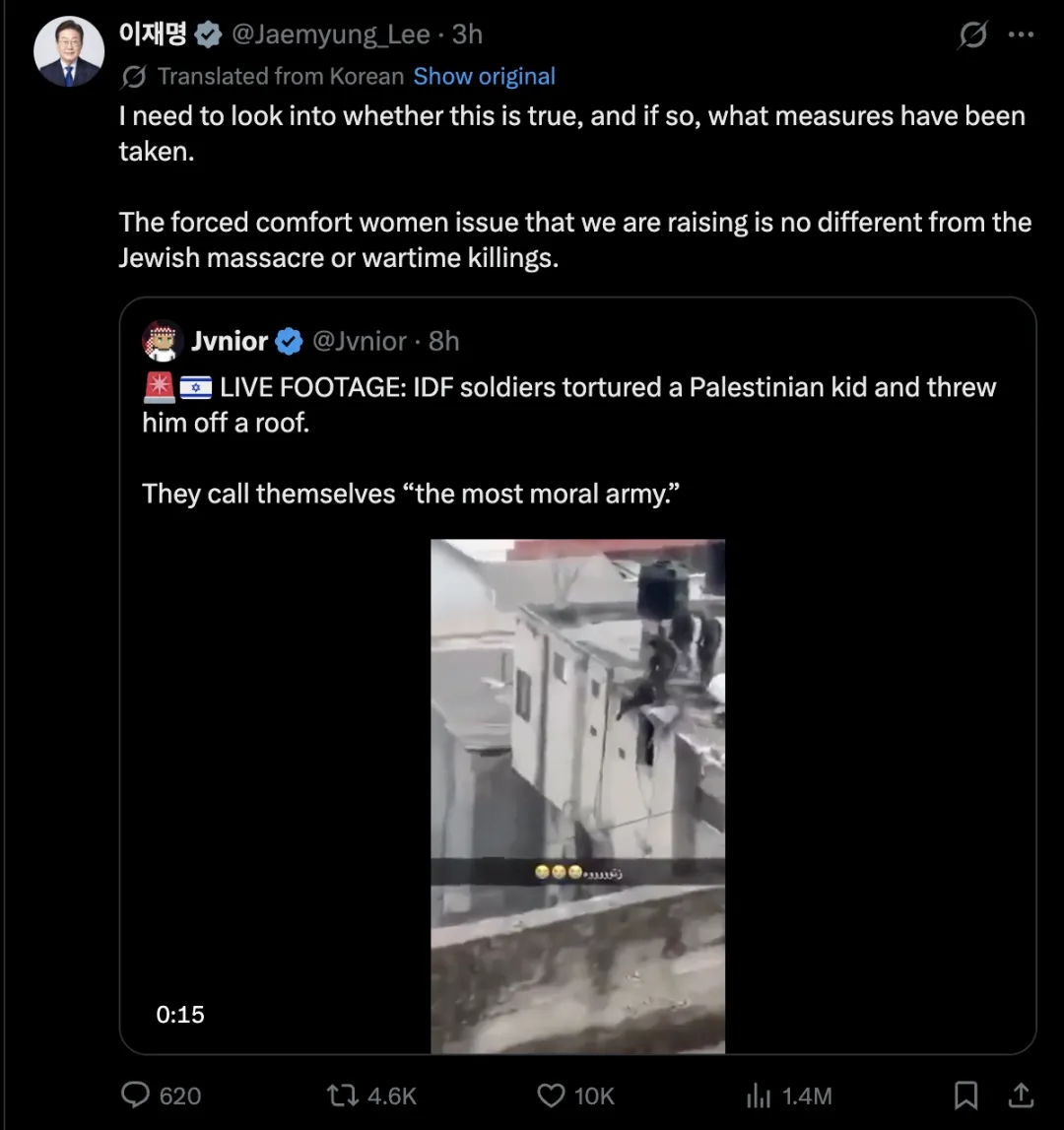 4月10日,韩国总统李在明转发以色列士兵折磨巴勒斯坦少年视频并发声:我们必须查清楚。