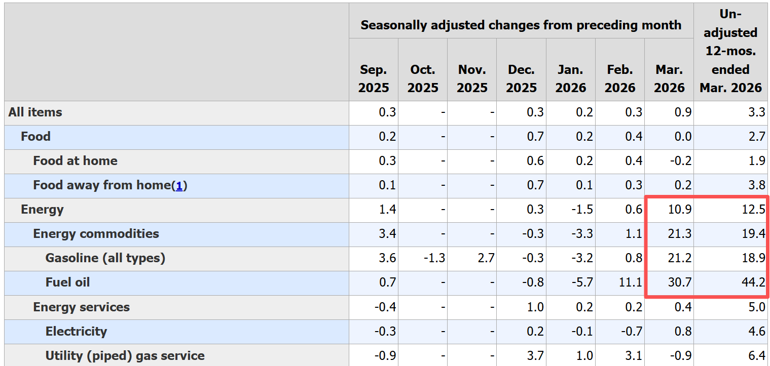 3月的美国通胀数据完全取决于油价。能源价格环比暴涨10.9%,为2005年以来最大月度涨幅。其中,汽油价格上涨了21.2%,为至少自1967年以来最大单月涨幅,燃油也上涨了30.7%。如果中东战事继续僵持,高昂的能源价格迟早会传导至经济的方方面面。