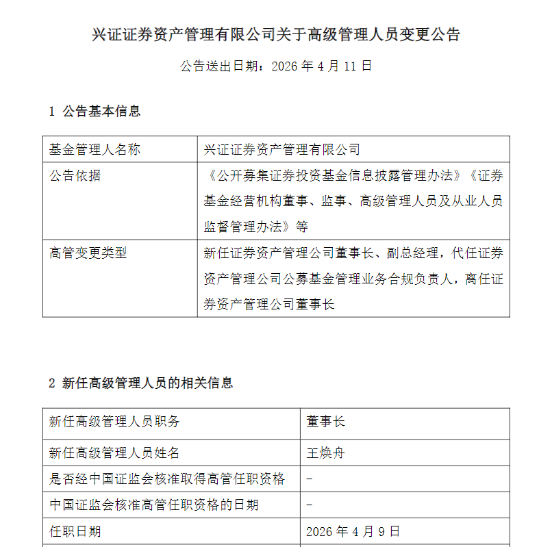 财联社4月11日讯 (记者 王玉玲)4月11日,兴证资管发布公告,正式任命王焕舟为董事长,原董事长刘宇因工作调动原因,不再担任董事长一职。