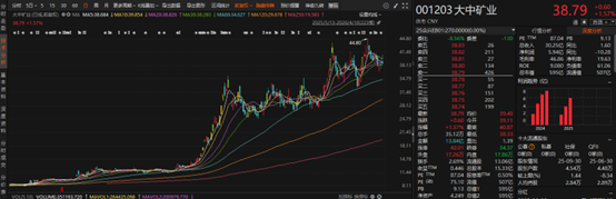 大中矿业湖南鸡脚山锂矿通天庙矿段及四川加达锂矿首采区经自然资源部评审备案的锂矿折合碳酸锂当量超472万吨,资源量在国内处于领先地位,且未来增储空间较大。大中矿业3月23日公告,与全球化工巨头万华化学达成深度合作,直接锁定未来明确的业绩预期。据双方签署的协议,此次合作是从股权绑定、产能共建到供销闭环的全链条深度捆绑——双方拟共同设立合资公司投建年产20万吨锂盐项目,其中一期3万吨,提前锁定万华化学的锂盐需求。二级市场方面,大中矿业自2025年9月低点以来,股价累计最大涨幅达301.43%。