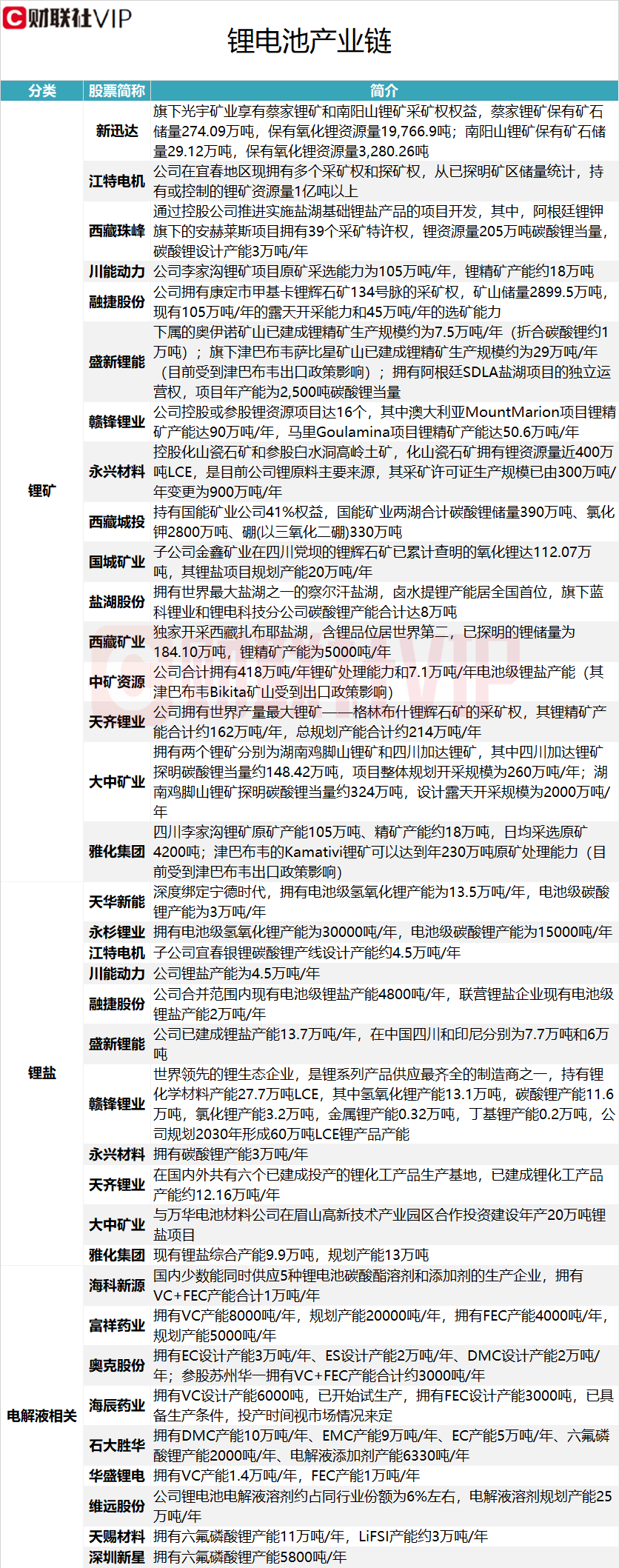 据财联社VIP盘中宝•数据栏目此前梳理,锂电池产业链中,锂矿产业涉及的上市公司包括新迅达、江特电机、西藏珠峰、川能动力、融捷股份、盛新锂能、赣锋锂业、永兴材料、西藏城投、国城矿业、盐湖股份、西藏矿业、中矿资源、天齐锂业、大中矿业、雅化集团,具体情况详见下图: