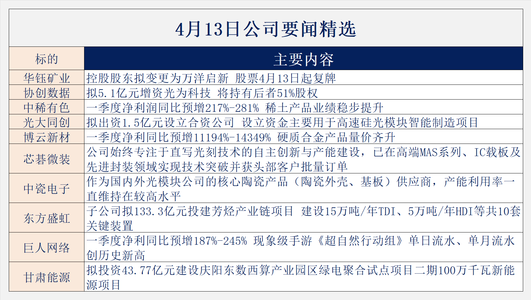 点评:创一年新高个股较上个交易日减少17家至125家。其中,前三的芯片、数据中心、机器人概念分别有37、30、30家个股创一年新高。历史新高个股占比中CPO位列第一,方正证券表示,持续看好高速光模块市场继续受益于北美云服务商2026年资本开支的高投入,巨大的AI算力训练与推理需求驱动AI算力集群网络端部署,国内相关高速光模块企业有望维持高行业景气度。相关个股:汇绿生态的控股子公司武汉钧恒是一家专业从事以光模块、AOC和光引擎为主的光通信产品的研发、生产和销售的企业;深圳华强向光模块领域客户供应Murata(村田)的MLCC、硅电容等各品类元器件,同时,公司积极拓展光模块、应用于高速光模块的光电芯片等产品的授权分销业务。
