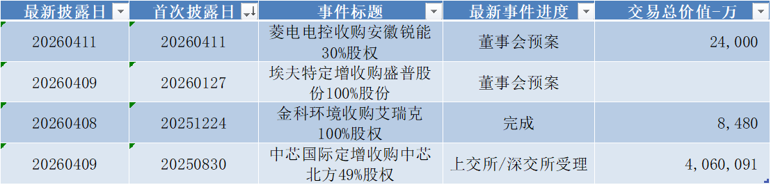 本周科创板并购最新进展共4条:菱电电控收购安徽锐能30%股权、埃夫特定增收购盛普股份100%股份、金科环境收购艾瑞克100%股权、中芯国际定增收购中芯北方49%股权,其中第一条属于本周首次披露。