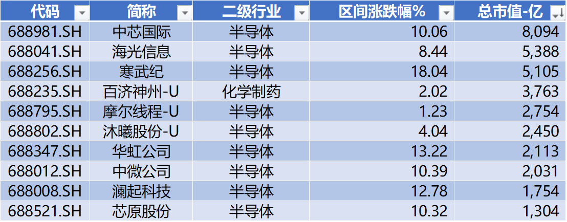 上图是本周科创板前十大权重公司呈现普涨,其中寒武纪涨18%居前,摩尔线程-U涨1.23%居末。