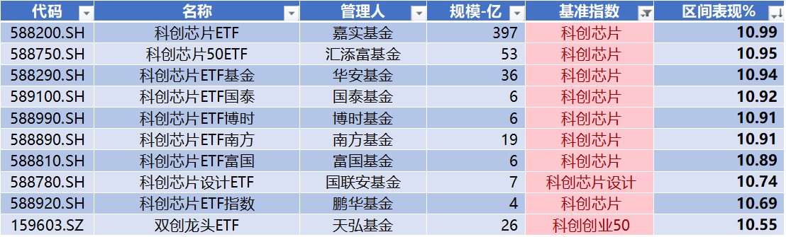 上表是本周市场表现按照降序排列的科创板ETF基金,本文选取前十名。本周科创板ETF中,芯片主题ETF表现居前。