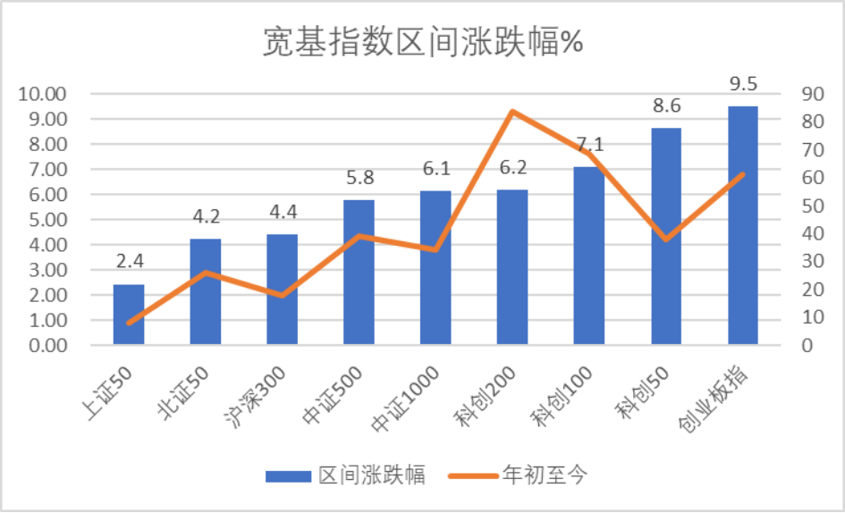 如上图,本周A股主要宽基指数呈现普涨,创业板指涨9.5%居前,上证50涨2.4%居末。科创50、科创100、科创200分别涨:8.6%、7.1%、6.2%。