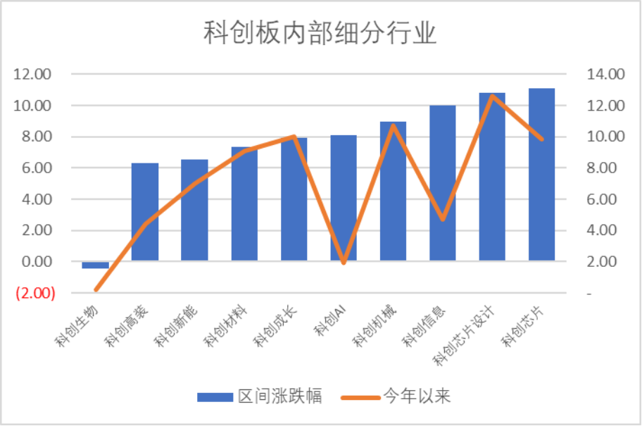 如上图所示,本周科创板内部呈现大部分上涨,除医药生物外全部上涨,其中芯片板块居前。