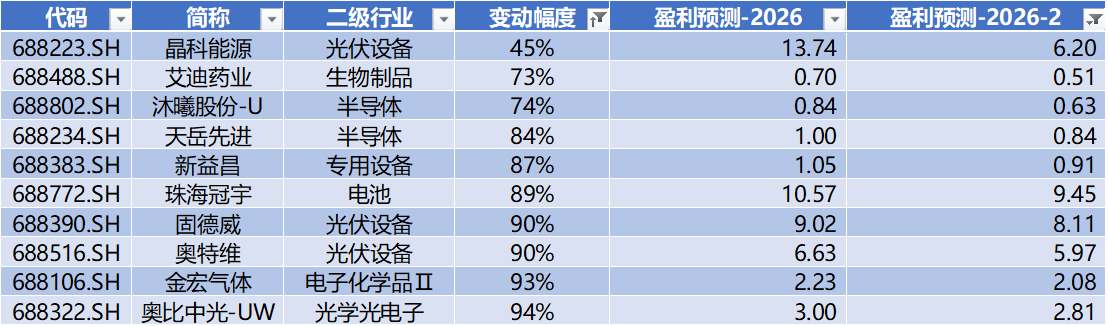 下降有29本文选取其中幅度最大的前十家(若不足十家则按实际数量列示),分别为:晶科能源、艾迪药业、沐曦股份-U、天岳先进、新益昌、珠海冠宇、固德威、奥特维、金宏气体、奥比中光-UW。