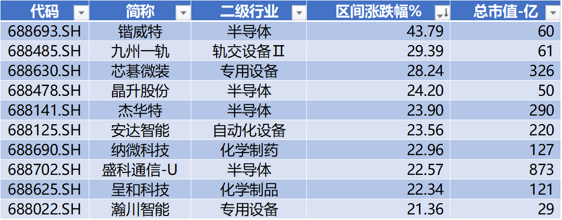 上表是本周涨幅榜前十公司,排名前十的公司分别是:锴威特、九州一轨、芯碁微装、晶升股份、杰华特、安达智能、纳微科技、盛科通信-U、呈和科技、瀚川智能。