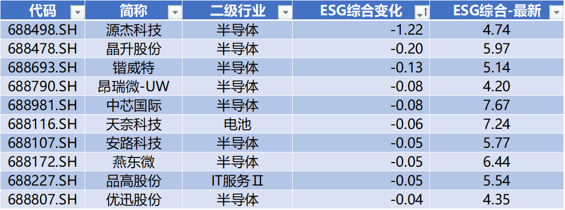 上表是ESG评分变化下降的前十家公司,分别为:源杰科技、晶升股份、锴威特、昂瑞微-UW、中芯国际、天奈科技、安路科技、燕东微、品高股份、优迅股份。