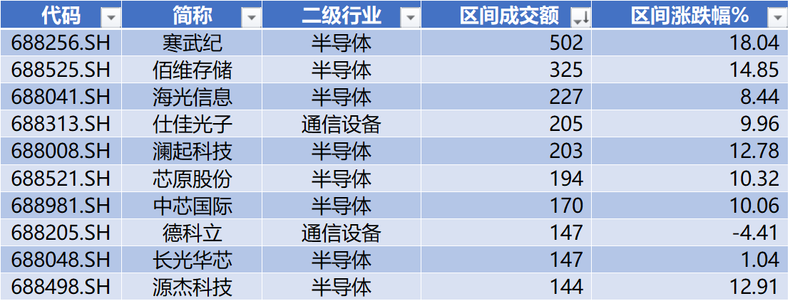 上表是本周成交额(亿)前十公司,分别为:寒武纪、佰维存储、海光信息、仕佳光子、澜起科技、芯原股份、中芯国际、德科立、长光华芯、源杰科技。