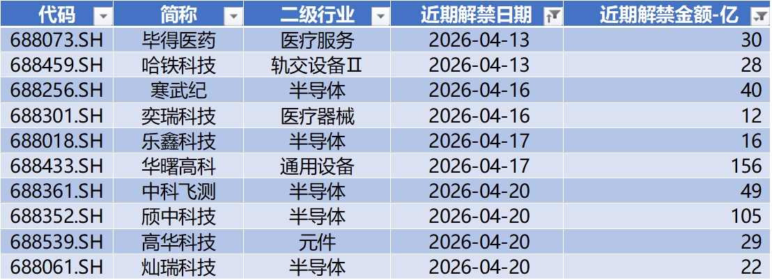 经过wind数据终端查询,近期有解禁的公司,本文剔除金额小于5亿的部分,然后按照时间顺序由近至远,选取前10家公司,分别为:毕得医药、哈铁科技、寒武纪、奕瑞科技、乐鑫科技、华曙高科、中科飞测、颀中科技、高华科技、灿瑞科技。