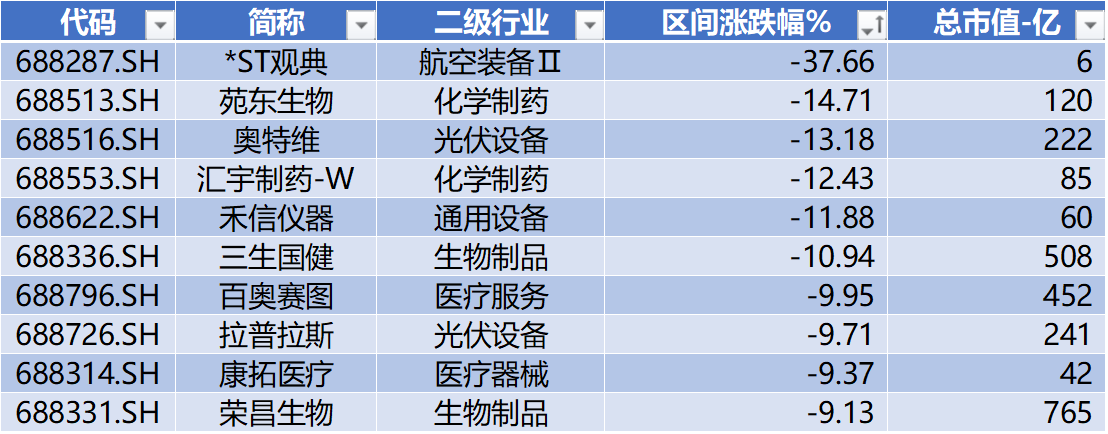 上表是本周跌幅榜前十公司,分别为:*ST观典、苑东生物、奥特维、汇宇制药-W、禾信仪器、三生国健、百奥赛图、拉普拉斯、康拓医疗、荣昌生物。