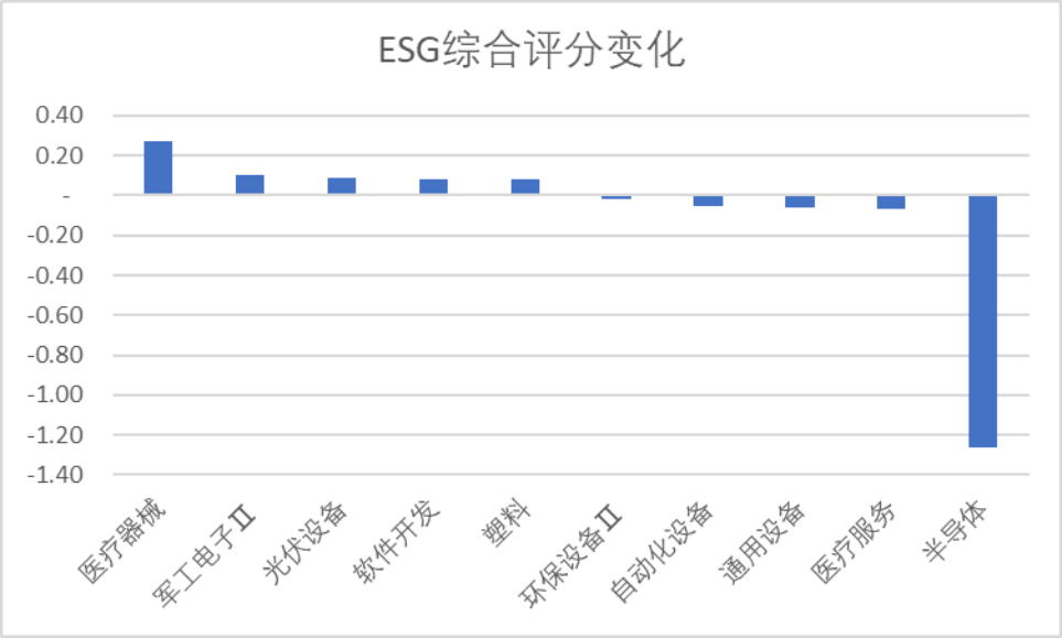 上图是本周ESG评分变化行业分布,本文统计了排名最高和最低的5个行业,本周ESG评分变化排名变化最大的细分行业:医疗器械、军工电子、光伏设备。