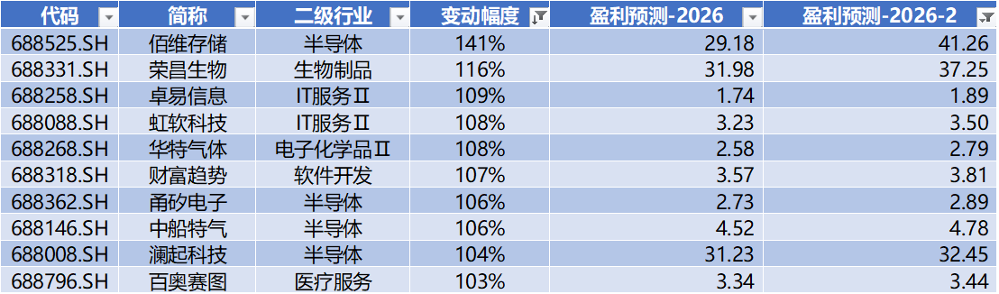 上表是本周盈利预测(规模净利润预测值)中值上调/下移的公司,其中上调有16家,本文选取其中幅度最大的前十家(若不足十家则按实际数量列示),分别为:佰维存储、荣昌生物、卓易信息、虹软科技、华特气体、财富趋势、甬矽电子、中船特气、澜起科技、百奥赛图。