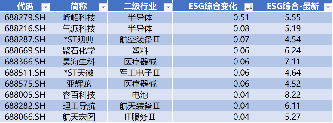 上表是ESG评分变化上升的前十家公司(剔除新上市公司),分别为:峰岹科技、气派科技、*ST观典、聚石化学、昊海生科、*ST天微、亚辉龙、容百科技、理工导航、航天宏图。