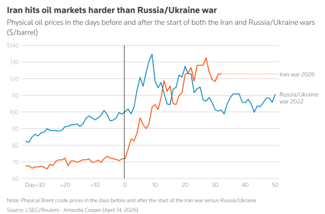 油价虽已低于3月份的高点,但目前每桶约100美元的水平,仍比2月底高出约40%。对实体经济而言更令人担忧的是,炼油商为近期交货的北海原油支付的现货价格已超过每桶140美元,几乎是战前行情的两倍。