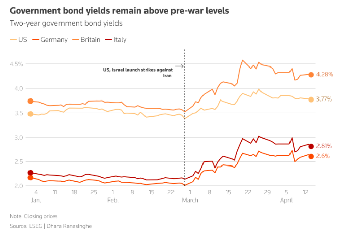 高企的油价,意味着债券市场眼下与股票市场的状况截然不同。从美国到欧洲乃至日本的政府借贷成本,目前远高于战争爆发前的水平。