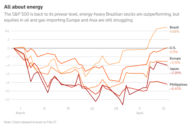 这样的分化首先体现在跨资产类别之中——美国股市已收复了自战争爆发以来的全部跌幅,但油价仍居高不下,拖累了政府债券和黄金价格。