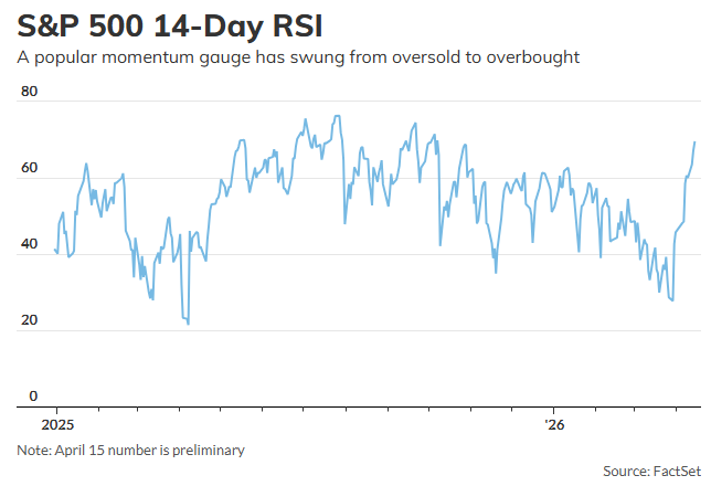 技术分析师通常使用该指标来衡量市场动能。读数高于70通常表明指数已进入“超买”区域,而读数低于30则代表“超卖”。截至周三收盘,RSI指数报69.3。
