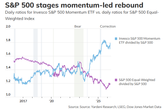Yardeni指出,专注于动量股的ETF在4月份的表现优于标普500指数。与此同时,标普500指数的表现也优于其等权重指数——这表明科技巨头股正在承担大部分上涨动力。