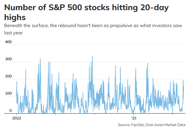 尽管标普500指数自3月抛售以来的反弹势头强劲——但股市上涨的广度尚未达到投资者在2025年4月关税风波后所见证的水平。