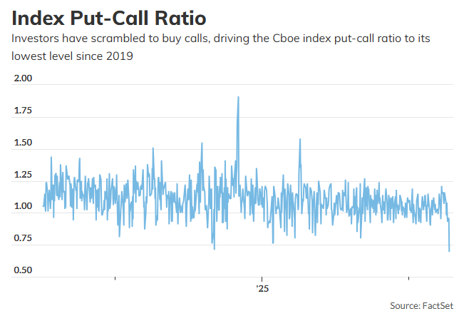 期权交易员在极短时间内正从极度看跌转为极度看涨。芝加哥期权交易所(Cboe)的指数看跌/看涨期权比率的走势印证了这一点——随着交易员大量买入看涨期权,该比率周二跌至了2019年以来的最低水平。