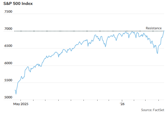 周三,随着标普500指数进一步攀升至历史新高,其首次收盘突破了7000点这一关键的心理关口。投资者对美国与伊朗之间看似脆弱的停火协议似乎能够得以维系感到振奋——尽管穿越霍尔木兹海峡的船只数量仍远低于冲突前的水平。