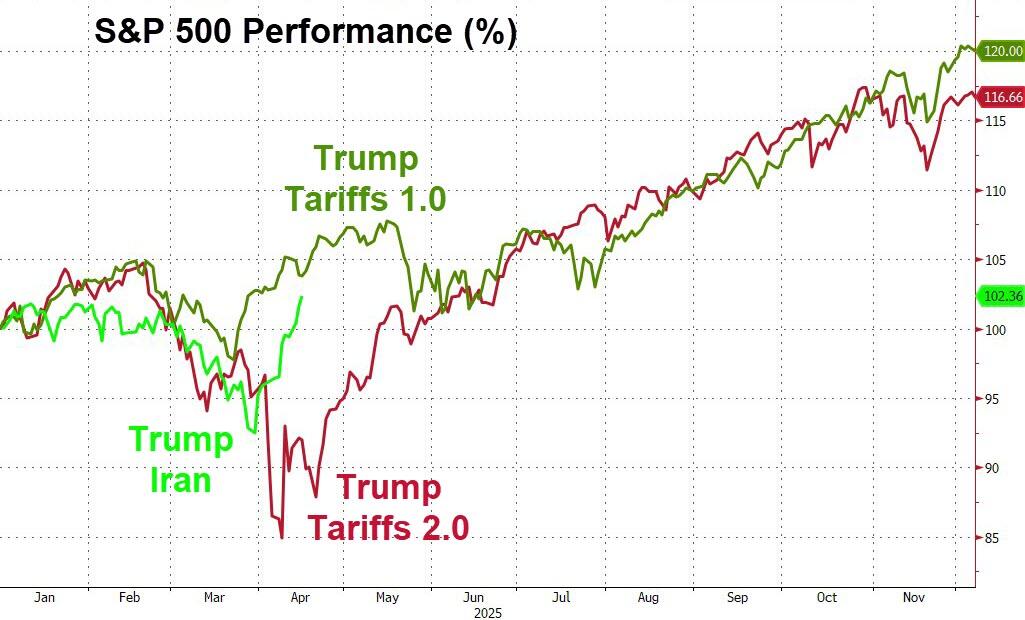 类似的K线V型反转走势,对许多美股投资者来说可能很“熟悉”。如下图所示,在特朗普1.0和2.0贸易战期间,美股“先抑后扬”的走势也几乎与当前美伊战争阶段如出一辙。