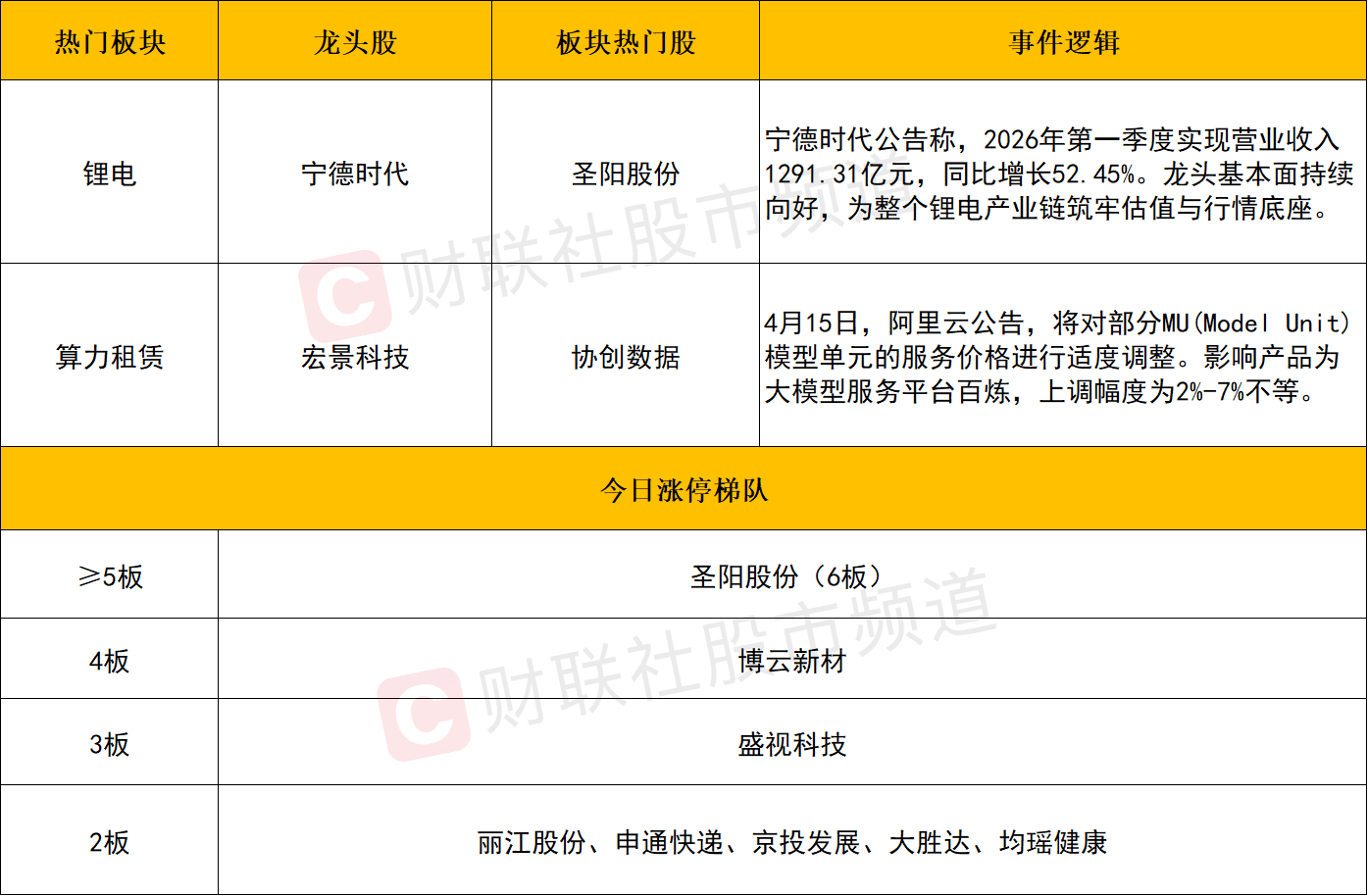 个股层面,今日市场还是呈现结构性分化,热点围绕着锂电与算力链展开。宁德时代受一季度业绩高增催化涨超5%,续创新高的同时总市值反超中国石油跃居A股第三,此外像圣阳股份晋级6连板,大中矿业4天2板、天华新能自公布一季报后6个交易日涨超50%。算力租赁方向全线爆发,宏景科技20CM涨停续创新高,协创数据3天涨超50%。算力硬件方向同样反弹,特发信息、通鼎互联等涨停,昨日调整的新易盛与天孚通信今日双双放量修复,中际旭创也于盘中刷新新高。目前市场主流风格还是以景气驱动下的趋势炒作为主,后续仍可在短线震荡过程中寻找低吸机会。
